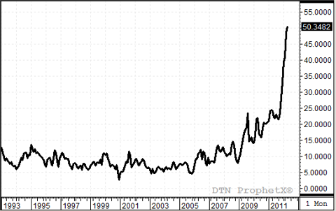 Förhållandet mellan oljan och naturgasen i USA har med kraft brutit nivån 50, vilket betyder att olja nu är femtio gånger dyrare än vad naturgasen är (per fat WTI-olja / mmBtu naturgas). Den stora skillnaden i pris mellan dessa två råvaror är minst sagt intressant, då det endast krävs sex till åtta enheter naturgas för att skapa samma mängd energi som ett fat olja.