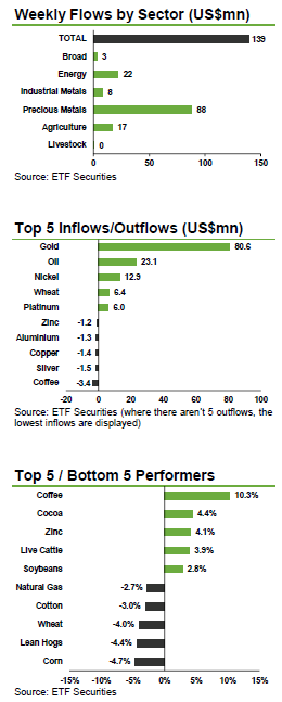 Wheat ETPs see US$6.4mn of inflows as the recent price correction is deemed excessive. The Australian Bureau of Meteorology expects below average rainfall in the north-eastern and south-eastern wheat growing areas over the next few months. Investors are building positions in the hope that the large surpluses forecasted by the USDA prove wrong, which could lead to the next price rally. At the same time, profit taking drove US$2.5mn out of ETFS Daily Leveraged Coffee (LCFE), as the Arabica coffee price jumped by over 10% last week. Heavy rains at the tail end of the harvest in Brazil, the biggest producer, could lower the quality of the coffee beans that are currently being harvested.