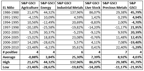 The Oceanic Niño Index har indikerat åtta historiska El Niño-perioder i tidsramen sedan 1983. Överraskande är det inte priserna på råvaror inom jordbrukssektorn som gynnats mest av detta fenomen, åtminstone inte initialt. Notera att det endast är under 4 av 8 perioder som El Niño har lett till stigande spannmålspriser, med en något genomsnittligt negativ avkastning.