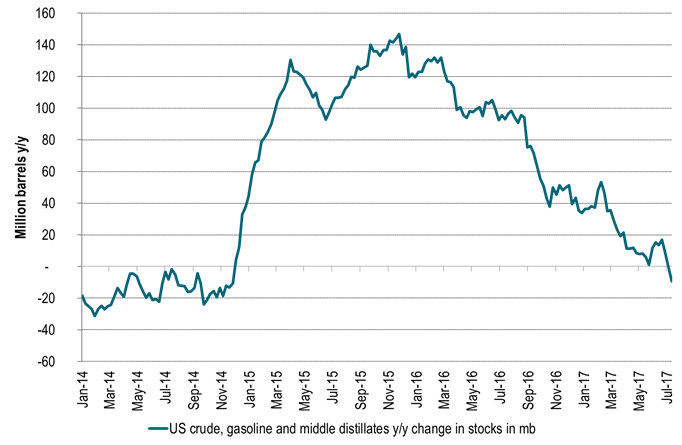 We concur with Barkindo. Inventories will draw down in H2-17. Point in case here is inventory draws in data from the last four weeks indicating draws of some 50 mb. During three weeks in June however these data instead showed a gain of close to 50 mb instead. That was part of the reason why oil prices fell in June and bottomed out on June 21st.