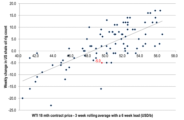 Ch4: US shale oil rig count versus WTI 18mth prices starting to come in on the low side – losing rigs