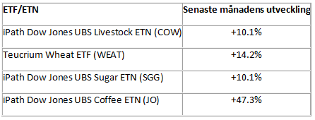 Faktum är att PowerShares DB Agricultural Fund (NYSEARCA: DBA) har stigit med mer än 13 procent under den senaste månaden då försörjningsfrågor har kommit att driva priserna på flera jordbruksråvaror. Oron för försörjningsproblemen är särskilt tydlig är det gäller jordbruksprodukter där inte mindre fyra råvaror har stigit med mer än 10 procent under den senaste månaden. Uppgången illustreras i tabellen nedan med utvecklingen för ett antal börshandlade produkter (ETFer och certifkat).