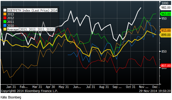 Etanolproduktionen fortsatte upp i veckan till en ny rekordnivå på 982,000 fat per dag. Samtidigt faller etanolpriset i samklang med oljepriset. I fredags när NYMEX öppnade igen efter Thanksgiving på torsdagen, föll WTI-oljan med över 10%.
