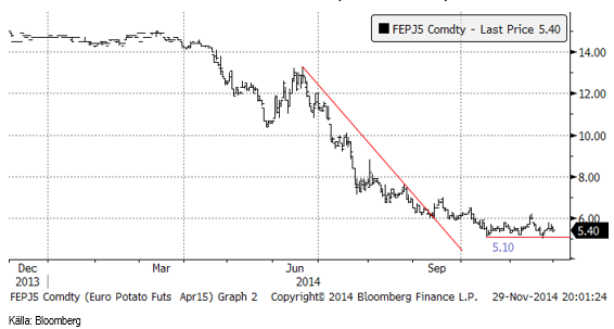Potatisterminen steg i veckan som gick från 5.20 till 5.40 euro per 100 Kg. Marknaden verkar för närvarande ha ett starkt stöd vid 5.10. På ovansidan verkar marknadens aktörer tycka att 6 euro är ”dyrt”.
