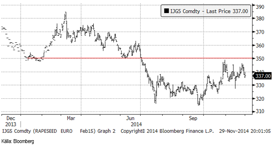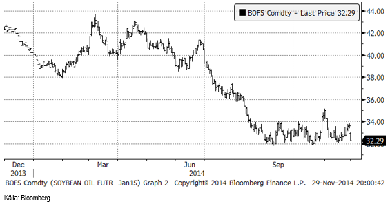 Det stora prisfallet på råolja efter OPEC:s besked att produktionen inte sänks, fick priset på socker via etanolkopplingen att falla kraftigt. Det fick även priset på sojaolja att falla kraftigt via biodieselkopplingen. Än så länge har marknaden inte handlat ner smörpriset pga prisfallet i vegetabilisk olja och hela effekten av prisfallet på råolja har troligen inte spridit sig fullt ut till jordbruksprodukterna som berörs.