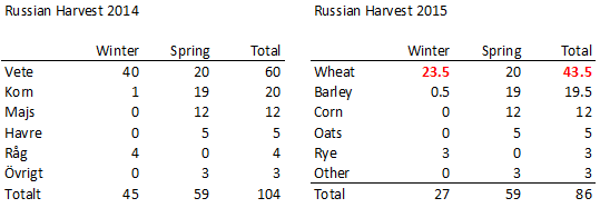 I år har av allt att döma mycket vete lagts på lager. En betydande del av det har hamnat på strategiska lager. Det pågår ju en konflikt med västvärlden och Ryssland importerar som nämnt inte mat därifrån. Det är inte säkert att konflikten håller i sig till nästa år.