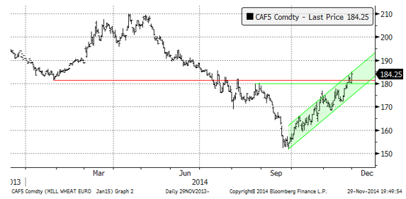 Matifs januarikontrakt har handlats upp prydligt i sin trendkanal. I fredags stängde marknaden vid den övre gränsen för trendkanalen, vilket kan innebära att handeln blir mindre positiv när den öppnar igen efter helgen.