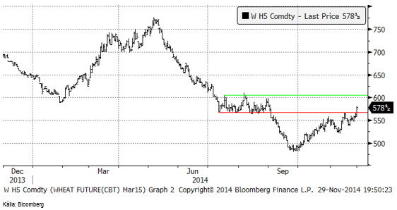 Chicagovetet (mars) där handeln var stängd under torsdagen för Thanksgiving, och öppnade igen klockan 15:30 CET, tog ett stort kliv upp under veckans sista handelssession. Det första motståndet bröts och nästa ligger vid 600 cent.