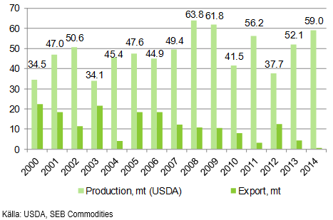 USDA FAS höjde sitt estimat för skörden 2014/15 från 101 mt (spannmål) till 102 mt. De estimerar exporten till 30 mt.