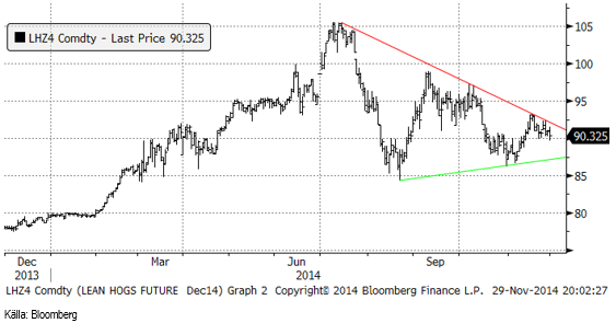 Lean hogs decemberkontrakt backade något till 90.325 cent i veckan. Triangelformationen i prisutvecklingen syns ny tydligt och motståndet på ovansidan bekräftades återigen i veckan. Det är omöjligt att säga om den här konsolideringsfasen följs av upp- eller nedgång. Det bästa är att avvakta och se på vilken sida som triangelformationen bryts.