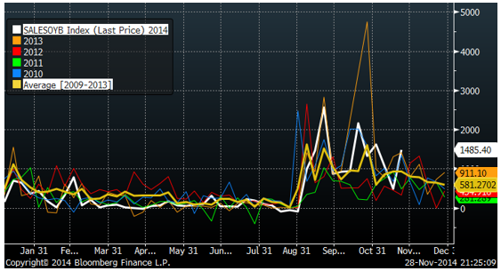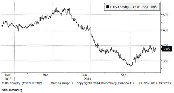 Priset på socker lyckades i veckan inte bryta motståndet. Istället föll priset på råsocker kraftigt efter OPEC:s beslut att inte begränsa produktionen av råolja, vilket ledde till ett kraftigt prisfall på råolja. Eftersom socker via etanol konkurrerar med bensin, fick detta sockermarknaden på fall. Den brasilianska valutan försvagades också kraftigt i fredags efter att Dilma Rousseff utsett en ny finansminister, Joaquin Levy. Han, liksom den nye budgetministern, är utbildade vid University of Chicago och förmodligen alltså ganska sympatiskt inställda till marknadsliberalism, och mindre positiva till de stöd till konsumtion som kanaliserats från olika delvis statliga företag, framförallt via Petrobras. Målsättningen med utnämningen sades vara att försöka få bättre balans i statens budget. Brasiliens stora hopp har varit oljan, men situationen är nu rätt prekär efter det stora oljeprisfallet.