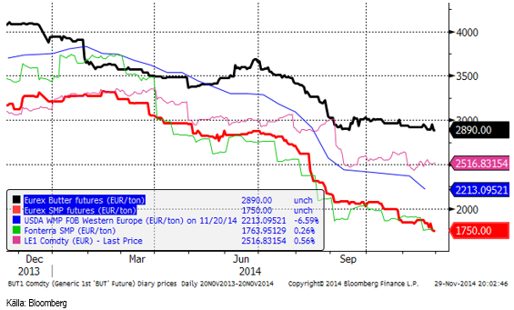 Det stora prisfallet på råolja efter OPEC:s besked att produktionen inte sänks, fick priset på socker via etanolkopplingen att falla kraftigt. Det fick även priset på sojaolja att falla kraftigt via biodieselkopplingen. Än så länge har marknaden inte handlat ner smörpriset pga prisfallet i vegetabilisk olja och hela effekten av prisfallet på råolja har troligen inte spridit sig fullt ut till jordbruksprodukterna som berörs.