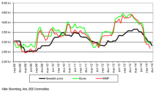 Decemberkontraktet på SMP på EUREX sjönk med 5% och de lite längre kontrakten med 1%. Decemberkontraktet på smör var oförändrat i pris på veckan, men de längre kontrakten handlades tre till fyra procent lägre. Detta betyder att värdet i kronor av mjölkråvara basis SMP och smör sjönk med 3% för decemberleverans till 2.80 kr per Kilo och vinter- och vårmånaderna nästa år med 1% till ungefär 2.81 kr / Kg.