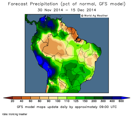 Nederbörden i Brasilien fortsätter att vara rikligare än normalt även den kommande tvåveckorsperioden. Det har nu regnat så länge och så väl att underskottet måste börja försvinna. I den senaste körningen med GFS-modellen ser vi också att även södra Brasilien och norra Argentina får mer regn än normalt.