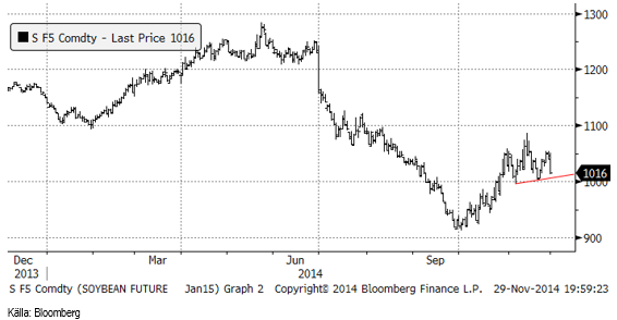 Priset på socker lyckades i veckan inte bryta motståndet. Istället föll priset på råsocker kraftigt efter OPEC:s beslut att inte begränsa produktionen av råolja, vilket ledde till ett kraftigt prisfall på råolja. Eftersom socker via etanol konkurrerar med bensin, fick detta sockermarknaden på fall. Den brasilianska valutan försvagades också kraftigt i fredags efter att Dilma Rousseff utsett en ny finansminister, Joaquin Levy. Han, liksom den nye budgetministern, är utbildade vid University of Chicago och förmodligen alltså ganska sympatiskt inställda till marknadsliberalism, och mindre positiva till de stöd till konsumtion som kanaliserats från olika delvis statliga företag, framförallt via Petrobras. Målsättningen med utnämningen sades vara att försöka få bättre balans i statens budget. Brasiliens stora hopp har varit oljan, men situationen är nu rätt prekär efter det stora oljeprisfallet.