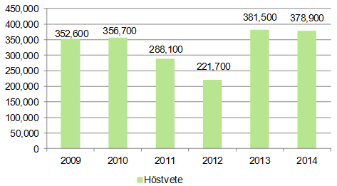 Jordbruksverket rapporterade i fredags att arealen höstvete i Sverige för skörd nästa år blivit nästan lika stor som förra året. I höstas såddes en areal på 378,900 hektar, jämfört med förra årets 381,500 hektar. Höstens areal är den näst största sedan 2009. Det innebär att det kommer att genereras ett stort överskott för export även nästa år.
