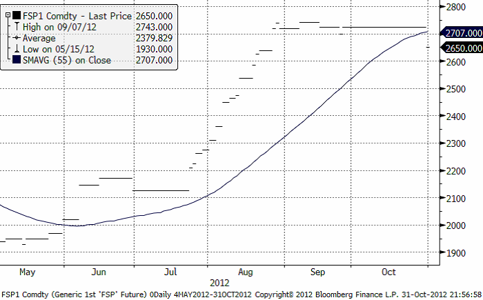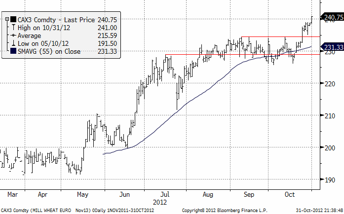 Ser vi till kontraktet med leverans efter nästa års skörd, november 2013-kontraktet, har det brutit över alla nivåer och passerade till och med 240 euro igår onsdag. Med den information vi hade förra veckan såg 240 ut som målkursen för uppgången. Nu har vi en konsolideringsnivå strax under 240. I och med att priset bröt upp från den, bör priset kunna gå upp till 245 euro per ton.