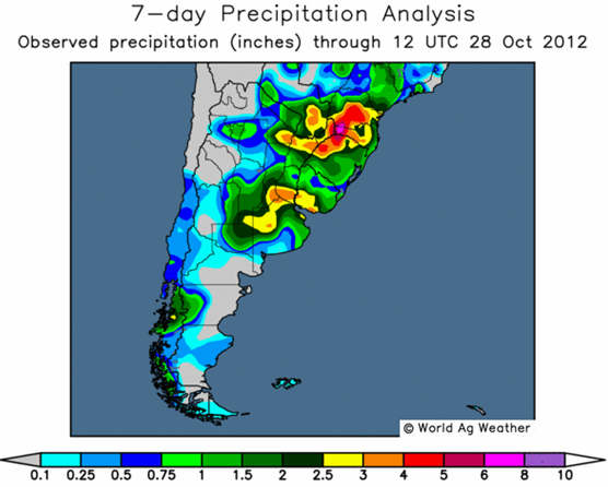Sådden av majs i Argentina är avklarad till 36.8 procent, jämfört med 55 procent vid denna tid förra året, som en följd av de kraftiga regnfall som har drabbat landet. Trots detta är prognoserna för landets majs grödor goda. Argentina är världens näst största exportör av majs efter USA, och det blöta vädret i kombination med ökad areal och ökad användning av gödningsmedel förväntas ge en rekord produktion under 2012/13 på 28-30 mt, vilket skulle överstiga det tidigare rekordet på 24 mt under 2010/11. Detta är alltså negativ information för majspriset.