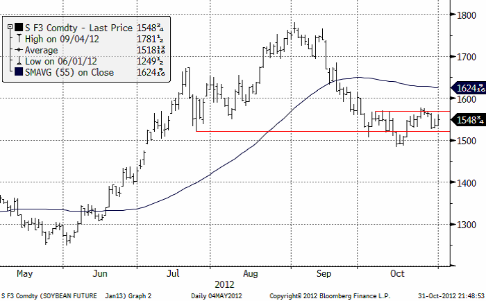 Januarikontraktet på sojabönor har påtagliga svårigheter att stiga i pris. Möjligen handlar de senaste två veckornas avbrutna prisfall om en konsolidering inför ytterligare prisfall. Det återstår att se, om priset faller under 1485 cent / bushel. Om priset faller under den nivån signaleras ytterligare prisfallspotential.