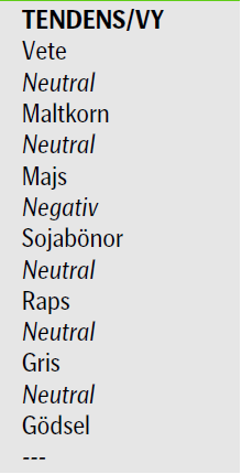 Sojabönorna och rapsen ser inte alls lika hausse-aktiga ut som vetet. Det är nu lite drygt en vecka kvar till nästa WASDE-rapport från USDA. Möjligen får vi se ytterligare en uppjustering i den amerikanska sojaskörden, i spåren av förbättrat väder. Vädret i Brasilien har varit bra, men sådden går inte framåt mycket snabbare än normalt, trots att lantbrukarna har sålt skörden redan i mycket större utsträckning än vanligt. Kinas senaste importsiffror var förvånande låga. Möjligen finns frågetecken också om efterfrågan. Det var länge sedan efterfrågan spelade en roll. Vi har ju vant oss vid en efterfrågan vid eller nära maximum de senaste åren.