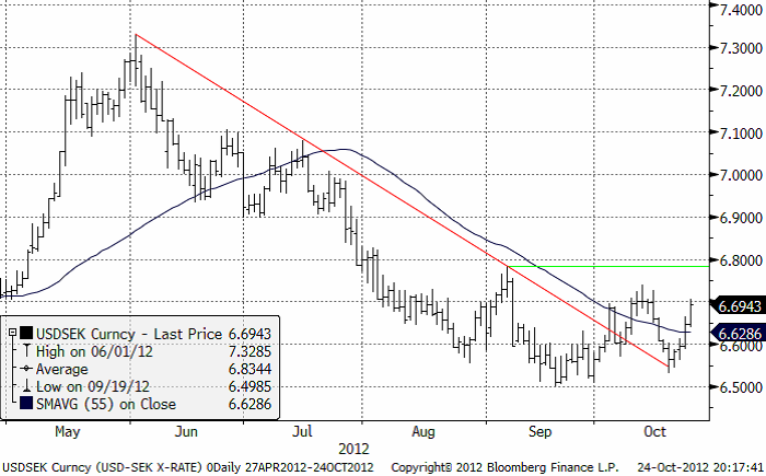 Dollarn befinner sig på en kursnivå med gott om stöd, historiskt. Dollarn har etablerat vad som skulle kunna vara en botten, varifrån försök till uppgång kan ske. Ett sådant försök är vad vi ser nu. Försöket kan gå upp mot 6.80, där ett motstånd finns. Bryts det, får vi en köpsignal för stigande trend.
