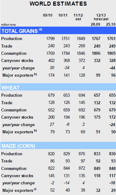 International Grains Council (IGC) fortsätter att justera ned sin prognos för den globala spannmålsproduktionen och i sin senaste rapport gör de bedömningen att produktionen kommer att minska med ytterligare 6 mt för säsongen 2012/13 till 1 761 mt. Den globala konsumtionen beräknas också falla, vilket är första gången på 14 år, samtidigt som nedjusteringen av produktionen också innebär en ytterligare minskning av utgående lager med 4 mt till 328 mt vid säsongens slut. För de största exportländerna (Argentina, Australien, Kanada, EU, Kazakstan, Ryssland, Ukraina och USA) noterades en minskning med 3 mt till 96 mt.