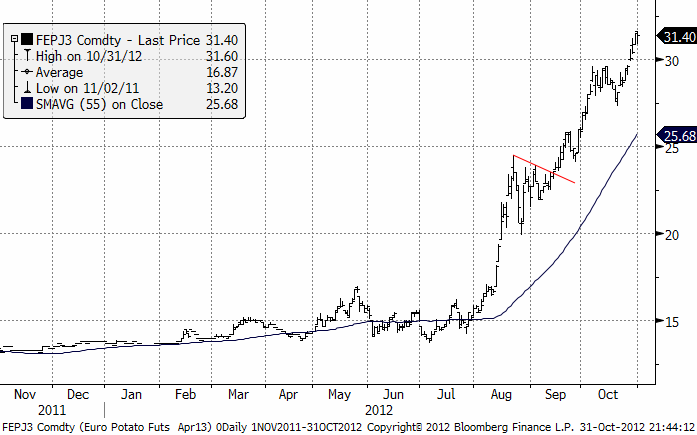 Potatispriset har fortsatt att stiga och noterade igår onsdag 31.40 euro per deciton. Det betyder att priset för årets skörd mer än fördubblats sedan början på augusti.