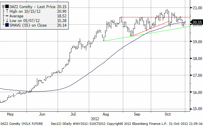 På den amerikanska börsen CME i Chicago har priset på Klass 3 mjölk rört sig ner från 20.30 till 20.15 cent per pund. Prisutvecklingen fortsätter alltså att tappa kraft. Styrkan i marknaden skulle kunna fortsätta och försvagas och senare leda till prisfall. Priset ligger just nu precis på stödlinjen. Ett brott nedåt skulle signalera förestående kursfall.