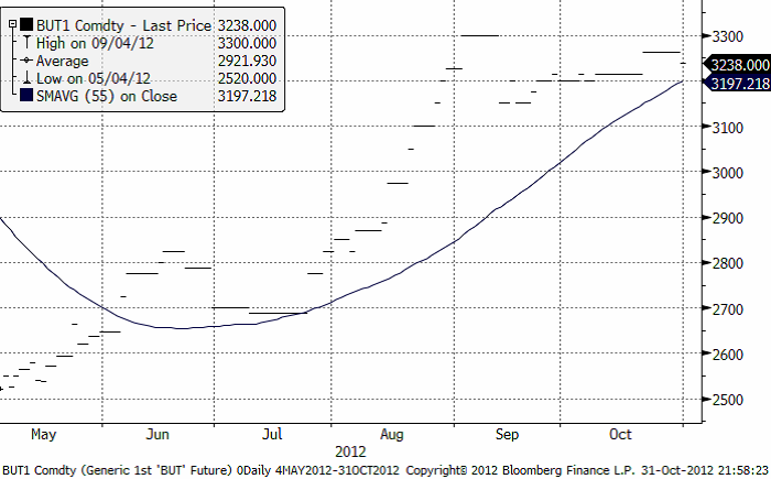 Ser vi till kontraktet med leverans efter nästa års skörd, november 2013-kontraktet, har det brutit över alla nivåer och passerade till och med 240 euro igår onsdag. Med den information vi hade förra veckan såg 240 ut som målkursen för uppgången. Nu har vi en konsolideringsnivå strax under 240. I och med att priset bröt upp från den, bör priset kunna gå upp till 245 euro per ton.