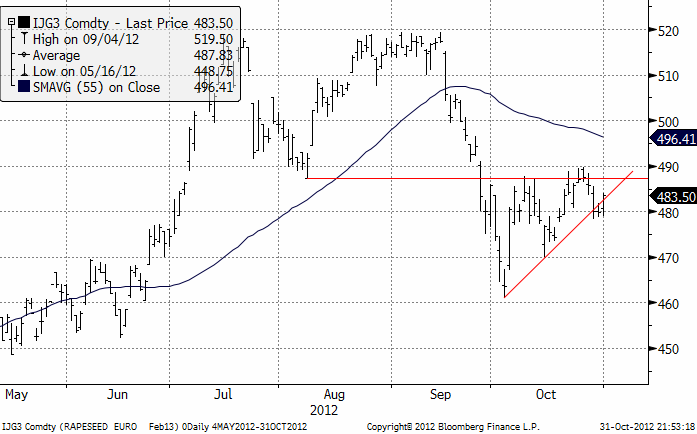 På vetemarknaden hopar sig orosmolnen för Argentinas och Brasiliens skörd. Lokala estimat ligger på 1 mt efter sänkningar i veckan, mot 11.5 mt i USDA:s senaste prognos. Det torra vädret som fortsätter att behålla sitt grepp om USA:s och Kanadas odlingsområden, i Ryssland och i Kina, ökar oron för nästa års skörd. På grund av detta har priset för leverans november 2013 fortsatt att stiga över tekniska motståndsnivåer på Matif i Paris.