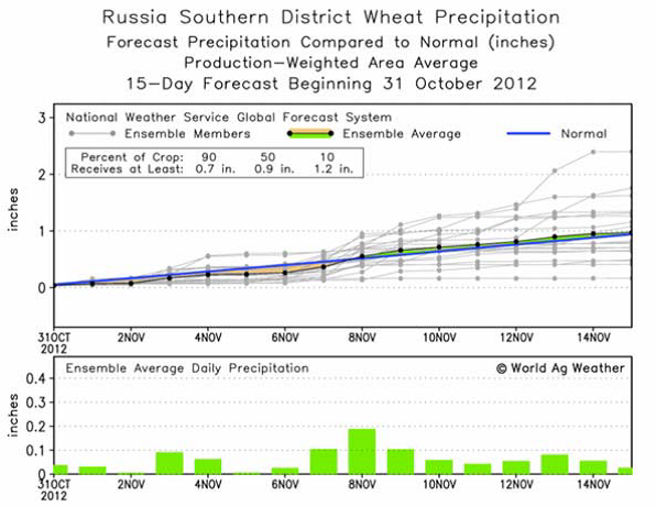 Det torra vädret fortsätter i de centrala delarna av USA, trots stormen Sandy vid östkusten. Väderleksprognosen för South Plains innehåller ingen nederbörd de kommande två veckorna. I Kanada finns även en viss oro nu för att det torra vädret ska påverka vårsådden. Detta gäller även den norra delen av prärien i USA. Kinas veteodlingsområden i norra delen av landet fortsätter att vara torra. Nederbörden i Europa ser ut att bli normal i den senaste väderleksrapporten. Vi har noterat att NOAA förutspår att den Nordatlantiska Oscillationen (NAO) kommer att gå in i sin negativa fas. Detta innebär att sjok av kall och torr ishavsluft drar in norrifrån och blockerar den vanliga västliga vinden i norra Europa. En typisk sådan vinterdag/natt är stjärnklar, iskall och vindstilla. Ryssland missar nederbörden i Europa. Med ett El Niño borta ur leken ser Australien ut att få god nederbörd. Den kommer dock för sent i odlingssäsongen och kan snarare göra skada. Argentina och Brasilien har haft mycket varmt väder. Kraftiga skyfall väntas komma över i synnerhet veteodlingsområdena i Argentina och södra Brasilien, vilket gör att man kan vänta sig försämrad kvalitet.