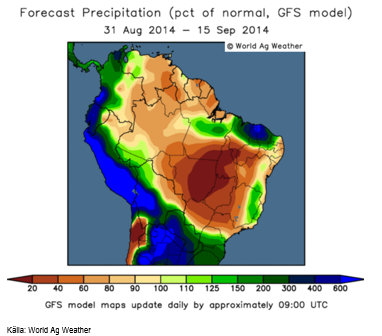 Torkan i centrala Brasilien tilltar enligt den senaste prognoskartan. Stora delar av Mato Grosso väntas få mindre än 1/5 av normal nederbörd de kommande två veckorna. Detta kommer efter en lång period av nästan lika lite nederbörd.