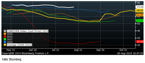 Som vi ser det har läget inte förändrats sedan förra veckan. Vi tror att det på kort sikt finns en uppenbar uppsidesrisk i vetepriset. Regnen minskar i EU och enligt prognosen kommer Indien att få mer än normal monsun. Däremot oroar den upptrappning som Ryssland gör i sitt krig med Ukraina. Igår, söndag, sänkte ryskt stridsflyg två ukrainska kustbevakningsfartyg och en separatistledare sade att Ryssland ska skapa en korridor till Odessa (på frågan om det var till Mariupol man ville skapa en korridor). Detta hände efter att EU fattat beslut om att införa nya sanktioner mot Rysssland. Det är dock oklart vad dessa ska bestå av och flera EU-länder är helt beroende av rysk gas till vintern. Möjligtvis förbereder Ryssland en landstigning i södra Ukraina och om detta sker är exporten från Ukraina och i förlängningen från Ryssland i fara. Det kommer då bara att gå att exportera via Östersjön. Ett scenario där globala balanser beräknas utan rysk och ukrainsk export har inte noll i sannolikhet.