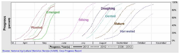 Måndagens Crop Progress visar att lantbrukarna fortsätter att göra framsteg vad gäller sådden av majs, vilken också översteg marknadens förväntningar, trots ihållande regn över majsbältet. Som nämnt ovan, var sådden per den 2 juni i de 18 största majsproducerande staterna avklarad till 91%, en ökning från 86% en vecka tidigare men något lägre än det femåriga genomsnittet på 95% vid den här tiden. Vårens kalla och blöta väder över majsbältet har gjort att årets sådd ligger något efter förra årets sådd som var avklarad vid den här tiden.