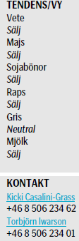 Priset på vete har gått ner något på Matif i veckan. Sojabönor har stigit ganska mycket, men ligger precis under ett tekniskt motstånd. Rapspriset på Matif gick i motsatt riktning. Den främsta förklaringen är att medan vädret är ogynnsamt för sojabönorna i USA, är det gynnsamt för rapsen i Europa och framförallt i Kanada. Grispriserna går åt helt olika håll i världen. Medan priset på den tyska Eurex-börsen är nära tvåårslägsta, har Lean Hogs noterat tvåårshögsta i Chicago. Fonterra-noteringen har fortsatt att falla, men priset på SMP har hållit sig stabilit på Eurex, samtidigt som terminspriset på smör stigit.