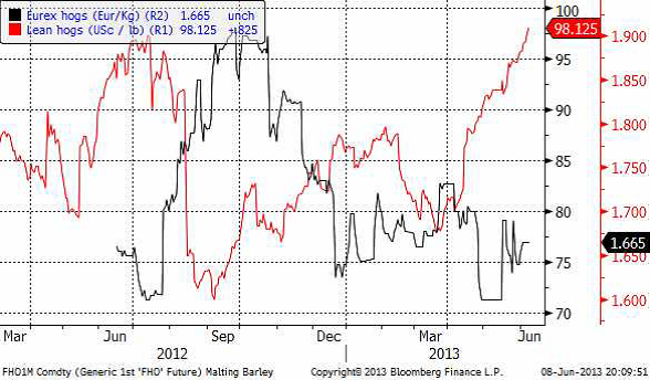 Medan priset på gris fallit i snart ett år på den tyska börsen, har priset på Lean Hogs i Chicago gått upp till den högsta nivån på flera år. Lean Hogs och det tyska grispriset har det senaste året gått åt motsatt håll även i de mindre rörelserna.