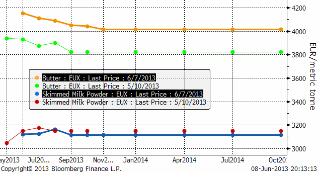 Nedan ser vi terminskurvorna på Eurex för smör och skummjölkspulver per i fredags kväll och för en månad sedan. Vi ser att terminspriserna på SMP gått ner marginellt, men att priset på smör gått upp en hel del.