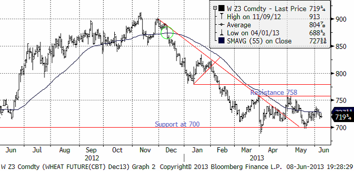 Decemberkontraktet på CBOT har inte visat stora tecken på att vilja gå ner. 700 cent utgör ett starkt stöd, liksom 758 cent ovanför utgör ett motstånd. Just nu och de kommande dagarna ser det ut att finnas möjlighet till ytterligare prisnedgång, ner mot 700 cent kanske och ett test av den nivån.