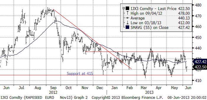 Rapspriset (November 2013) håller sig inom det prisintervall som det gjort sedan december. Det blev ett kraftigt prisfall i veckan dels på att Kanadas sådd går framåt och på ett kraftigt prisfall på rapsolja i den asiatiska marknaden. Medan det i USA är dåligt väder, är det mycket gynnsamt väder i Kanada.