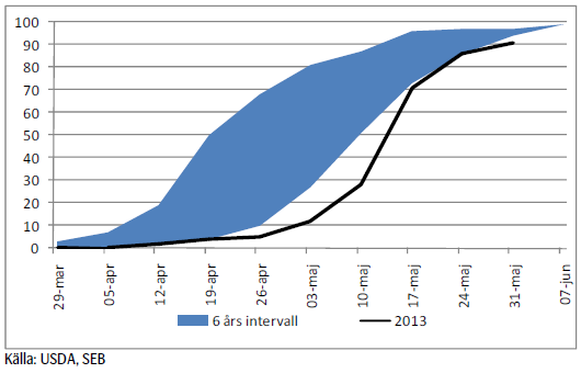 I Iowa, den största producenten, är sådden endast avklarad till 44% – vilket är långt efter det femåriga genomsnittet på 91% vid denna tid – samtidigt som sådden hos den näst största producenten, Illinois, nu är avklarad till 49%, en ökning från veckan innan men fortfarande efter det femåriga genomsnittet på 69%.