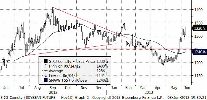 Sojabönorna har rest sig efter att ha alla bevis mot sig. Det kalla och blöta amerikanska vädret är vad som ligger bakom. Tekniskt är 1350 cent på novemberkontraktet ett starkt motstånd, markerat av topp i juli förra året, den övre delen av prisintervallet under oktober och november, en topp i december och en topp i februari.