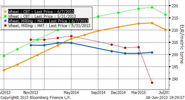 Majspriset (december 2013) har liksom vetet fått stöd den senaste tiden. Efter årslägsta notering i slutet av maj har priset stigit kraftigt uppåt, rekylerat ner och i fredags börjat ett nytt försök uppåt. Än så länge rör sig priserna under den nivån som uppnåddes innan plantings-rapporten från USDA i slutet av mars, men ett test av den nivån kan komma och i så fall kan priset nå ändå upp mot 600 cent. Det vore verkligen ett ödets ironi att vad som väntas bli den största skörden någonsin följs av prisuppgång. Fredagens prisuppgång följde på en förnyad prognos om kallt och vått väder i USA.