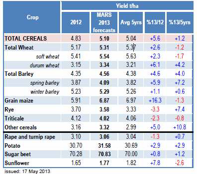 Estimatet för EU-27’s majs reviderades ner från förra månadens 6.96 t/ha till 6.87 t/ha, som dock är en ökning med 16.3% sedan 2012. Norra Italien har drabbats av kraftiga regn under maj månad vilket har försenat sådden av majs. MARS lämnar dock sin prognos för Italien oförändrad för nu, med reservationer för revideringar i avkastningen nedåt framöver. Prognosen för korn justerades däremot upp och ligger nu på 4.56 t/ha, en ökning från förra månadens 4.48 t/ha. Framförallt görs en rejäl uppjustering av höstkorn i Spanien med 25% medan marginella justeringar nedåt görs för t.ex Tyskland och Frankrike. Även avkastningen för vårkorn justeras upp med nästan 4%, också detta på grund av gynnsamma utsikter i Spanien.