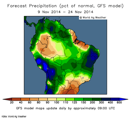 Brasilien fortsätter att se riktigt blött ut. Medan det torkdrabbade São Paulo får normal nederbörd, får Mato Grosso upp till 3 gånger normal nederbörd. Norra Minas Gerais och Goiás liknande väder. Dessa är de viktigaste delstarterna för produktionen av sojabönor. Minas är också centrum för kaffeproduktionen. Södra delarna av landet, där vete i viss mån odlas, visar prognosen dock fortfarande på mycket mindre nederbörd än normalt.