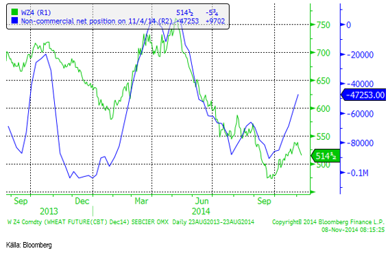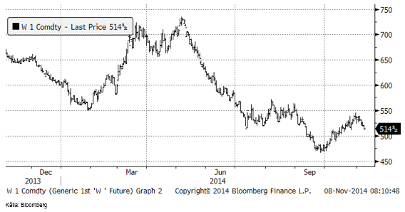 Chicagovetet (december) har varit fallande hela veckan. Amerikanskt vete har haft svårt att konkurrera framförallt med vete från EU och det är därför inte konstigt att priset faller. Dollarn har också stärkts, vilket motiverar ett lägre pris i Chicago, som föll med 3% i veckan. Contangot ligger på 9% omräknat till årsränta. Från 514.50 i fredags kan marknaden vilja testa 500 cent igen.