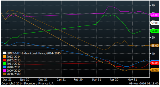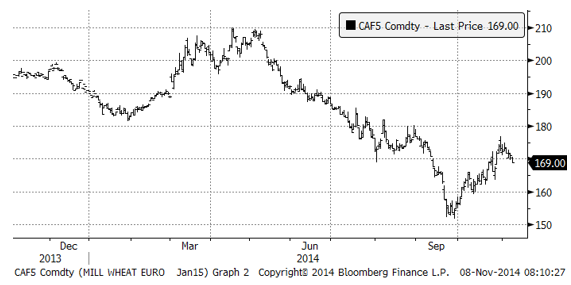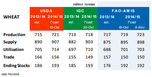FAO/AMIS publicerade sin ’AMIS Market Monitor’ i torsdags, den 6 november (fast det står ”9-Nov” i rapporten). FAO väntar sig 4 mt högre produktion, baserat på högre skördeestimat för EU och Ukraina. De väntar sig dock högre konsumtion av vete som foder, eftersom det finns gott om fodervete. Därför väntar sig FAO att utgående lager 2014/15 är oförändrat på 192 mt jämfört med förra månadens rapport. Lagren ökar framförallt i Kina, Indien och i Ryssland.