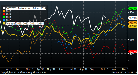 Etanolproduktionen backade något enligt veckans rapport från US DOE.