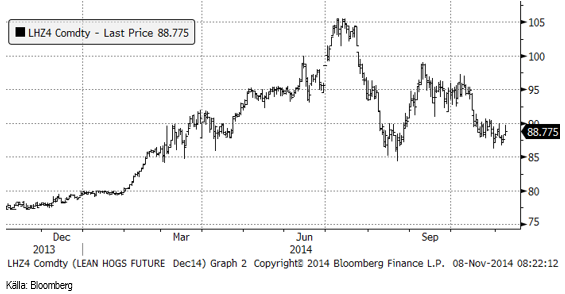 Lean hogs decemberkontrakt ligger kvar i prisintervallet mellan 87 och 90 cent. I fredags gjordes ett försök att bryta 90 cent, men där fanns uppenbarligen gott om säljare och marknaden stängde på 88.775 cent.