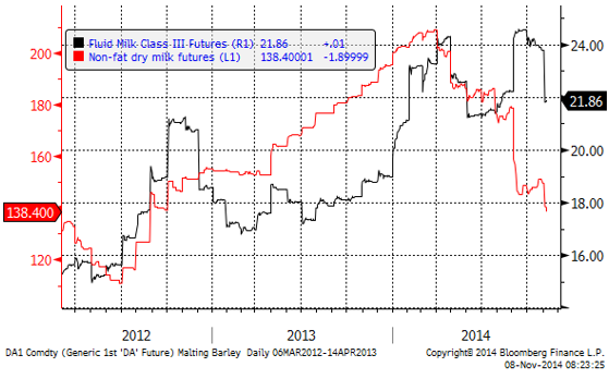 I USA, där priset på mjölkråvara noterades till rekordnivåer så sent som för lite drygt en månad sedan, har priset rasat ner från toppnivåerna vid 24 cent till 21.86 cent. Class 3 milk futures föll med 10% i veckan. Non-fat dry milk futures har dock varit i fallande trend sedan början av det andra kvartalet i år och föll ytterligare i veckan.