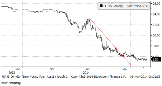 Potatisterminen som går mot aprilpriset steg med 4% i veckan. Det mesta av prisuppgången kom i fredags. Den senaste månaden har priset planat ut, men en uppgång är det ännu inte tal om. Att nedgången verkar ha förlorat kraft kan dock vara en utgångspunkt för en återhämtning upp mot i bästa fall 8 euro.